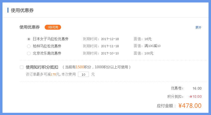 在報名支付費用時,可選擇積分抵扣,積分抵扣金額的比例為100:1(即100積分=1元)