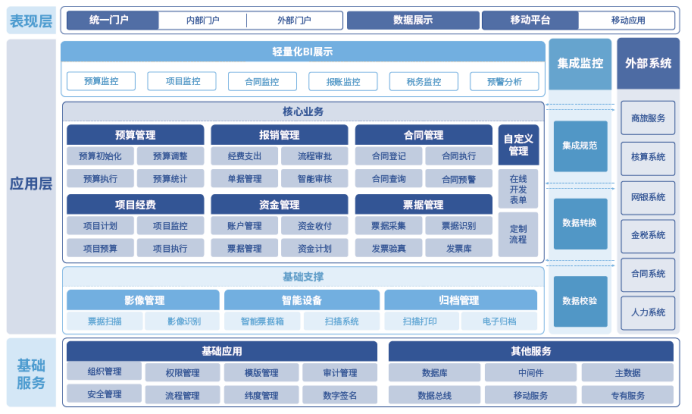 • ??財金管控系統是為適應集團化企業“戰略管控”、“財務管控”、“業務管控”的管理模式的現狀研發的產品,擁有“高可用、高擴展、高易用”的產品特色,將移動互聯、人工智能、大數據技術與財務信息化經驗(系統功能、安全保密、模塊劃分、業務需求等)積累充分結合,為企業提供符合自身業務特點的開放型財務共享服務平臺。